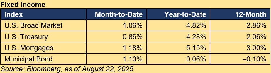 U.S. equities were mixed; small-caps, value, and cyclical groups outperformed but technology underperformed. Retail earnings highlighted consumer resilience. Inflation data and AI concerns pressured sentiment before dovish remarks from Federal Reserve (Fed) Chair Jerome Powell sparked a rally. Treasuries firmed, with the yield curve steepening, as markets priced greater conviction in a September rate cut.