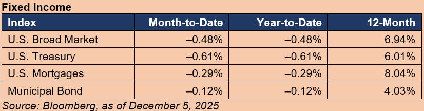 Stronger economic data generated concern among fixed income investors that the Fed might not ease rates as much as anticipated in 2026, causing weakness in the Treasury market. Yields on the 10-year rose from 4.02 percent to 4.14 percent.