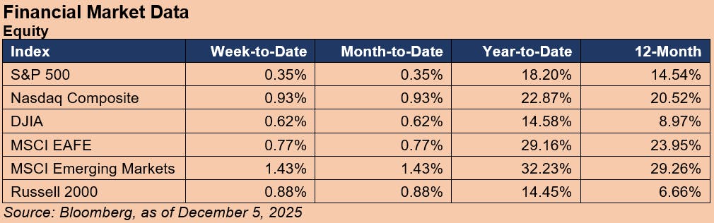 Led by the Nasdaq Composite and the small-cap Russell 2000, U.S. equities rallied again last week. Treasuries were weaker as stronger economic data had investors questioning the pace of Federal Reserve (Fed) easing in 2026. Service sector confidence, personal income and spending, and consumer confidence exceeded expectations, indicating the economy remains on solid footing.