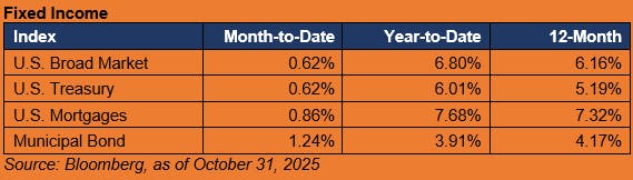 · As expected, the Fed delivered a 25 bps rate cut. Although rhetoric called into question whether another cut is expected next month, market participants continued to anticipate that economic data will lead to a December reduction.