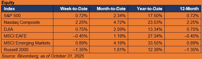 Led by the Nasdaq Composite, U.S. equities rose last week. Other indices had more muted returns, and the small-cap Russell 2000 declined for the first time in four weeks. Stocks sold off midweek after the Federal Reserve (Fed) lowered interest rates 25 basis points (bps), but stronger earnings led to a late-week rally. Treasuries declined modestly.