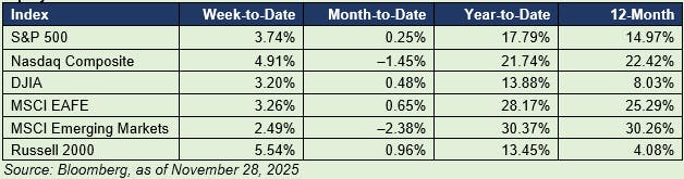 U.S. equities rallied across the board during the holiday-shortened week. The small-cap Russell 2000 led the market, growing more than 5 percent. Treasuries also rallied. Investors responded to more favorable commentary about the possibility of another interest rate reduction next week. Federal Reserve (Fed) speakers continued to cite concerns about the health of the labor market.