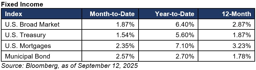 Treasuries firmed as investors positioned for this week’s FOMC meeting amid growing signs of labor market softening. A downward revision of nearly 1 million to payrolls boosted demand for duration and supported a flatter yield curve. Inflation data was mixed; headline CPI was slightly hot but core readings were steady and August PPI cooled. Markets expect a rate cut of 25 bps this week and additional easing by year-end. Credit spreads remained tight, reflecting steady risk appetite even as tariff headlines and weaker sentiment surveys added to growth uncertainty.