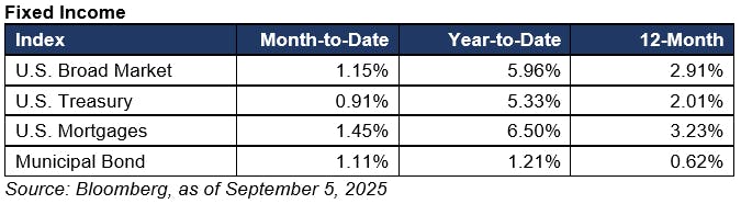 U.S. equities were mixed; the S&P 500 Index and Nasdaq Composite Index finished higher but the Dow Jones Industrial Average slipped. Tech and small-caps outperformed, whereas energy and utilities lagged. Treasuries rallied as weak labor data and rising jobless claims fueled demand. September rate cut expectations strengthened despite tariff uncertainty.