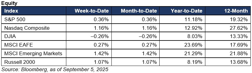 Equities were mixed in the holiday-shortened week, with the S&P 500 and Nasdaq Composite rising as the Dow Jones slipped. Tech outperformed; Alphabet and Apple rallied on a favorable antitrust ruling, lifting the Nasdaq more than 1 percent. Small-caps also advanced, reflecting rate-cut sensitivity. Technology services, health services, and non-energy minerals outperformed, whereas energy, utilities, and industrial services lagged. Labor market data disappointed, with nonfarm payrolls adding only 22,000 jobs, fueling hopes that the Fed will ease rates. Sentiment improved midweek but growth concerns capped gains, leaving equities consolidating near record levels.